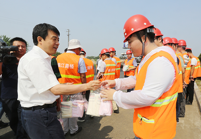 市长史立军慰问江广高速路面标段(高港)沥青摊铺现场施工工人(顾俊 摄)